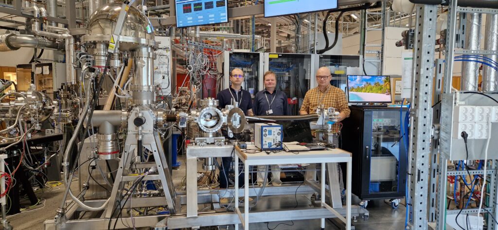 Researchers Rainer Pärna, Arvo Tõnisoo and Jaanus Kruusma at the FinEstBeAMS GPE endstation with the connected new SER setup ready for research. Photo by Antti Kivimäki.