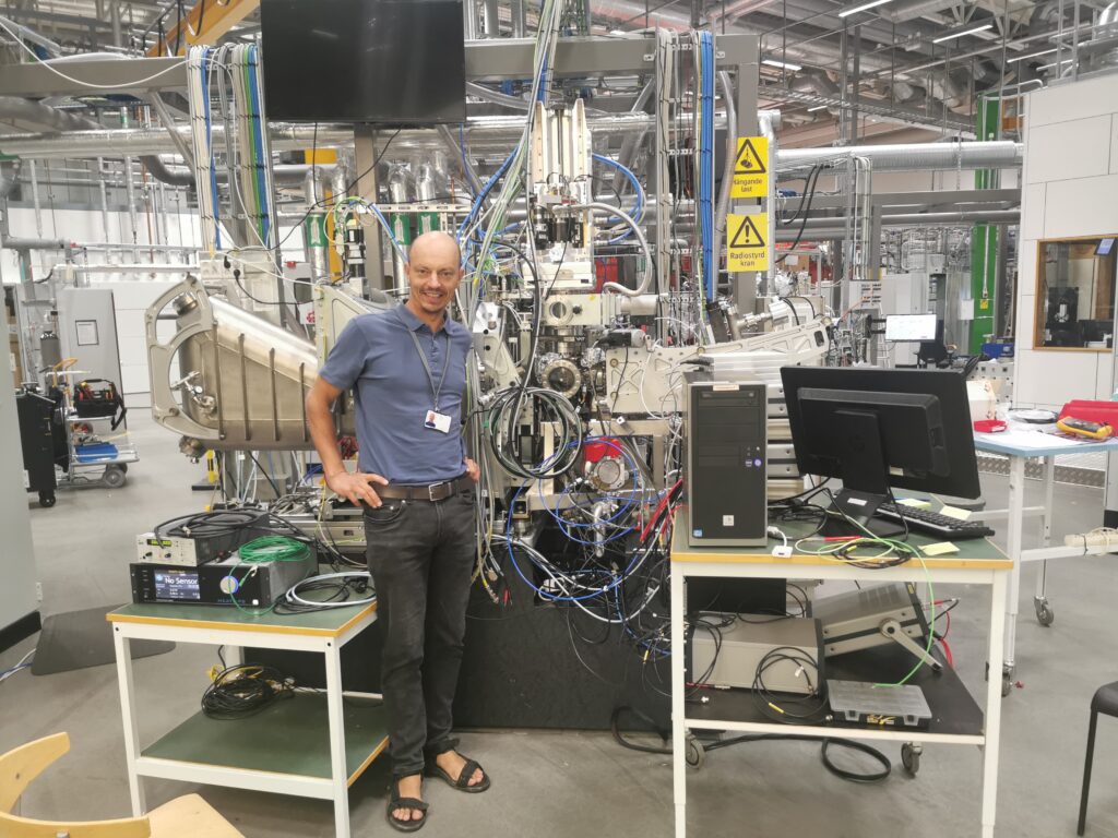 Researchers Rainer Pärna and Arvo Tõnisoo from the Institute of Physics and Jaanus Kruusma from the Institute of Chemistry of the University of Tartu had a beamtime at the FinEstBeAMS beamline in MAX IV laboratory between 25.08.25 and 01.09.25. At the beginning of the beamtime the new Sustainable Energy Research (SER) setup was connected to FinEstBeAMS gas phase endstation (GPE). The SER was tested investigating the electrochemical stability of the 1-ethyl-3-methylimidazolium tetrafluoroborate room temperature ionic liquid (RTIL) at T = 100 °C and electrochemically polarized micro-mesoporous molybdenum carbide derived carbon [MMP-C(Mo2C)] electrode (i.e. support). This test was followed by investigations of the electrochemical stability and adsorption behavior of 1-octy-3-methylimidazolium tetrafluoroborate RTIL at T = 30, 45, 60 and 100 °C and electrochemically polarized MMP-C(Mo2C) electrode. During these experiments core level electron binding energies of the RTIL elements at various working electrode (used as the support) potentials were measured using low-energy (“soft”) X-ray photoelectron spectroscopy. This will enable us to characterize the RTIL adsorption strength at the selected MMP-C(Mo2C) electrode potentials and give some more information about the changes in the electrochemical double layer structure at higher temperatures.