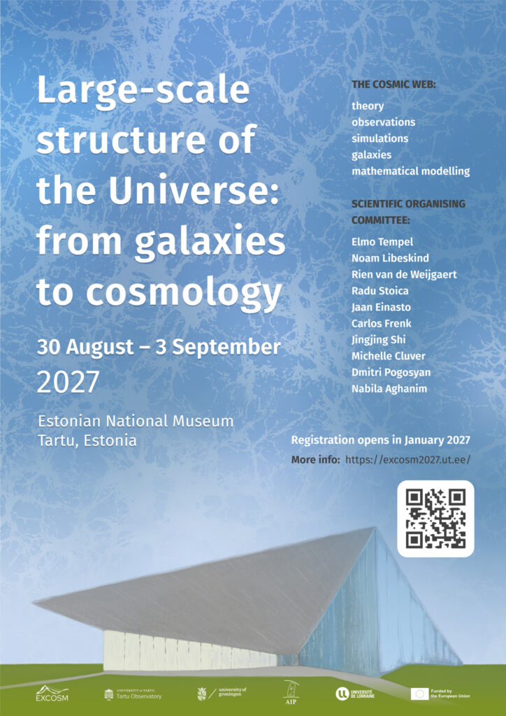 The final conference of the EXCOSM project “Large-scale structure of the Universe: from galaxies to cosmology” will take place 30 August – 3 September 2027 in the Estonian National Museum, Tartu, Estonia. Key topics of the conference will consist of the theory, simulations, and observations of the cosmic web, and cosmic web and galaxies as new analytical frameworks, astronomical surveys and simulation data enable using statistical inference to push forward our understanding about the formation and evolution of galaxies.