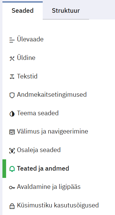 4. Kinnituskirjade saatmiseks saab kasutada LimeSurvey teadete saatmise funktsiooni. Selleks avage vasakust seadete menüüst menüülink “Teated ja andmed”: