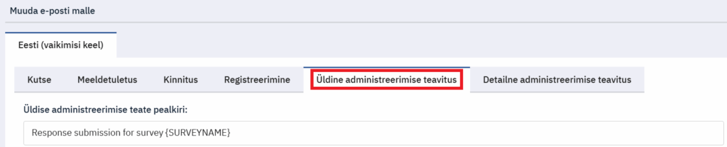 7. Valige lipik “Üldine administreerimise teavitus” ning sisestage teavituse pealkiri koos küsimustiku nimetuse koodiga ‘{SURVEYNAME}’, näiteks: “Vastus on edastatud küsimustikku {SURVEYNAME} “