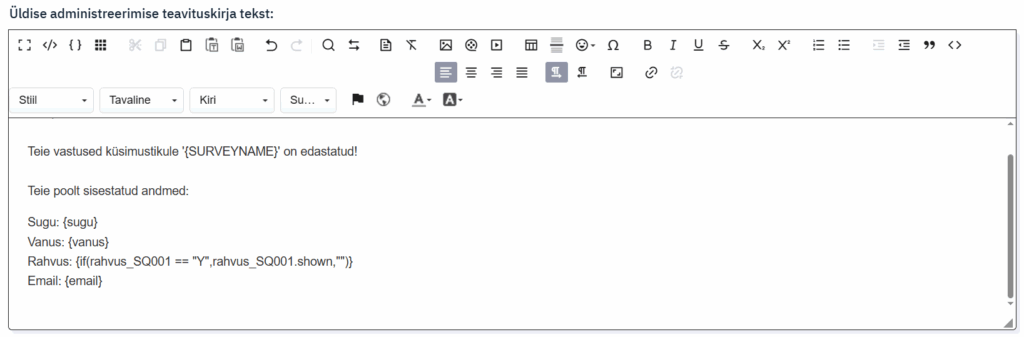 {if(rahvus_SQ001 == “Y”,rahvus_SQ001.shown,””)} – rahvuse vastust mitmikvaliku küsimuse tüübi (Multiple choice) puhul. SQ001 tähistab siin rahvuse küsimuse esimest valikut – kui see on valitud, siis kuvatakse teavituskirjas. Iga valiku puhul (SQ002, SQ003 jne) tuleb see if-lause lisaks luua nt kui on kolm valikut, siis peaks olema kirjareal järgmine {if(rahvus_SQ001 == “Y”,rahvus_SQ001.shown,””)} {if(rahvus_SQ002 == “Y”,rahvus_SQ002.shown,””)} {if(rahvus_SQ003 == “Y”,rahvus_SQ003.shown,””)};