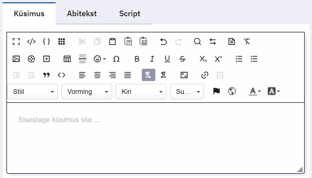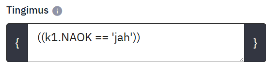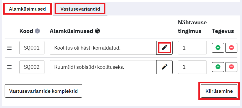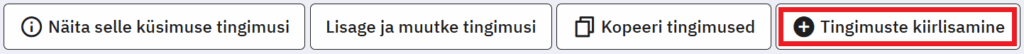 - Kui nt küsimusel koodiga k1 on kaks vastusevarianti koodidega v1– „maasikas“ ja v2– „vaarikas“ ja soovite, et mingit küsimust kuvatakse siis, kui valida k1 koodiga küsimuses vastus „vaarikas“, siis kirjutage selle küsimuse Tingimus reale valem ((k1.NAOK==’v2′)).
