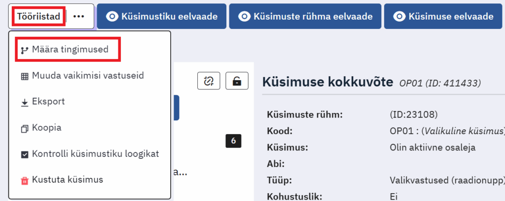 Kasutades Tingimus lahtrit küsimuse seadete lehel