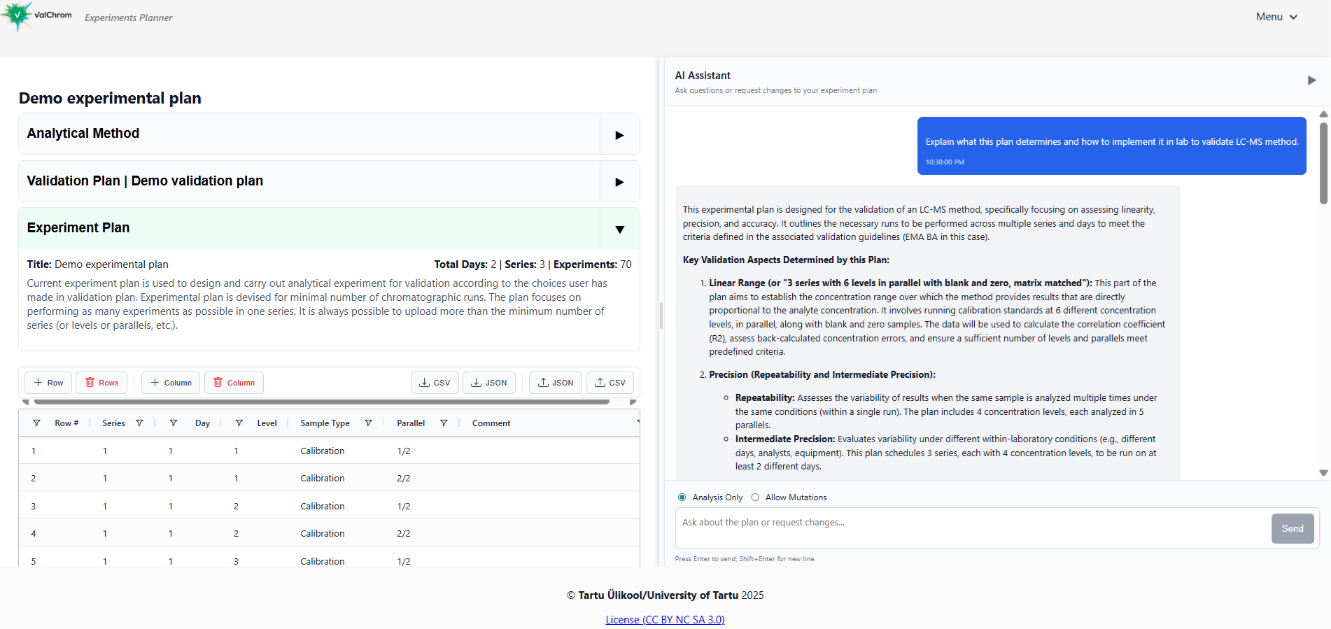 - Analysis Only: you can ask questions about the plan and how to interpret it or implement in lab. Try it out with this example prompt: “Explain what this plan determines and how to implement it in lab to validate LC-MS method.”