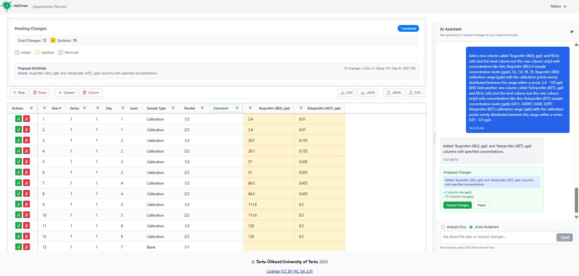 9. Open the experiment plan to display a list of experiments needed to complete in the laboratory to acquire data necessary for calculations. ValChrom combines experiments based on Validation plan template to get the optimal plan.