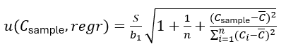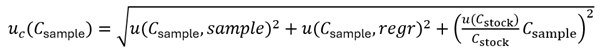 where n is the number of points on the regression line, Ci and Ai are the concentration and signal of the i-th calibration point, is the arithmetic mean of the concentrations Ci and Csample is the analyte concentration of the sample solution. S can be easily found using the LINEST function of the spreadsheet software. Cstock is the concentration of the stock solution and u(Cstock) is its standard uncertainty.
