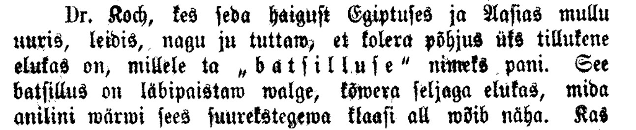 batsillus (Bacillus), pisikene kommasarnane elukas, ainult suurendawa klaasi all nähtaw, mis koolera-haigust etc. sünnitab; kolera-idu.